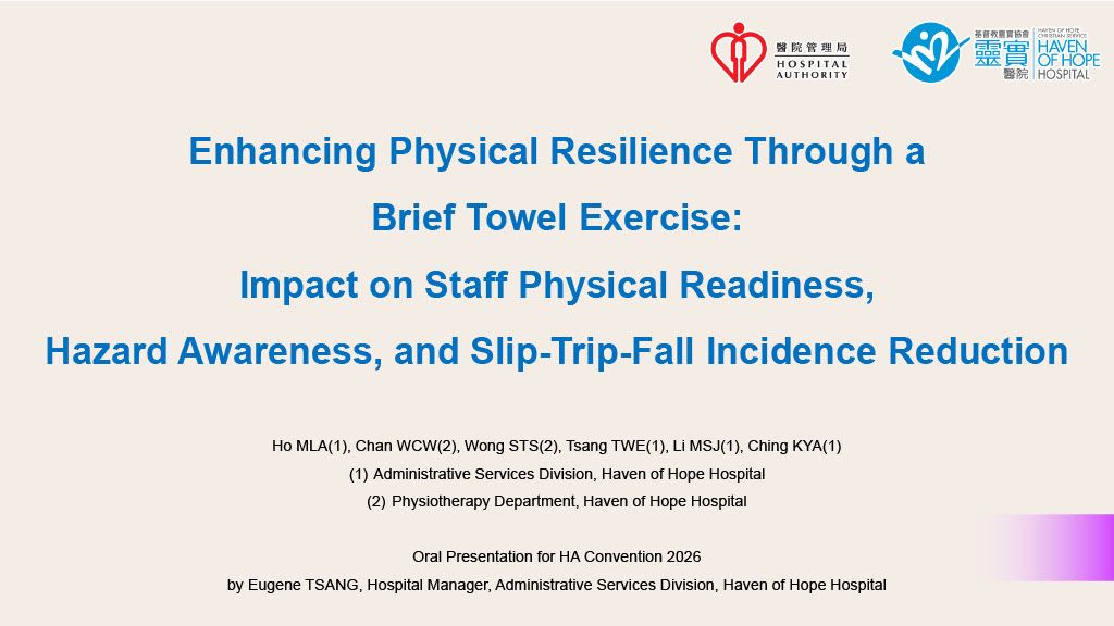 (1) Administrative Services Division, Haven of Hope Hospital, Hong Kong, (2) Physiotherapy Department, Haven of Hope Hospital, Hong Kong
