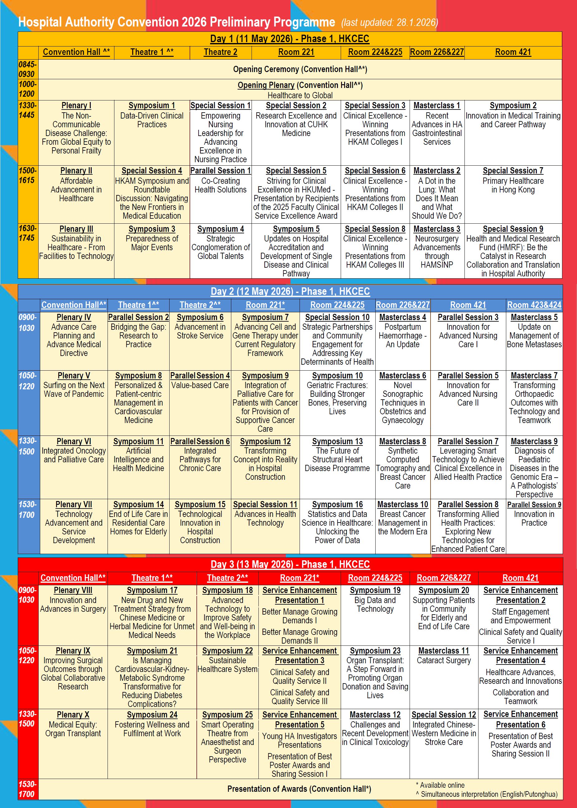 The scientific programme of the Hospital Authority Convention 2026 will focus on the Hospital Authority's core values, viz. "People-centred Care", "Professional Service", "Committed Staff" and "Teamwork", with topics on healthcare development and sustainability, chronic disease management, cancer treatment, palliative care and advance directives. Aiming to promote the sharing of knowledge and experience in clinical advances and approaches to modern healthcare service, the Convention facilitates exploration and discussion of contemporary concepts among healthcare professionals and stakeholders.